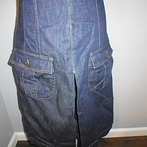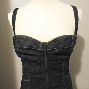 Alexander McQueen denim jumpsuit with sweetheart neckline. Front pockets and side zipper. Extra btton holes placed in the straps as seen in photos. Functional but not pretty and can’t be seen when worn.
