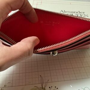 Brand new. Alexander McQueen dark pink skull charm wallet. Full embossed croc leather. Card slots on front. Zip top with roomy interior. Box and dust bag included. Certificate of authenticity included. No receipt.