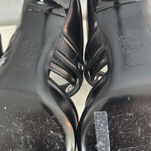 Calf-leather pointed-tip mules from alexander mcqueen featuring black, calf leather, open back, pointed tip, metal toecap, silver-tone buckle fastening, branded footbed, mid heel and slip-on style.