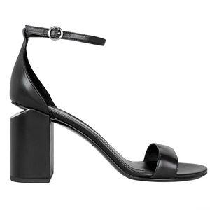 Alexander Wang's Abby leather sandals feature the label's signature cut-out along blocked heels. 3" block heel. Ankle buckle closures. Rhodium metal plate cutout. Leather uppers, lining, and soles. In black. Imported.