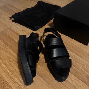 “Alisha flat polished calf sling back sandal with hidden metal buckle closure. Leather welt and thick rubber outsole. Rubberized leather footbed for additional comfort. 100% polished calfskin.…”