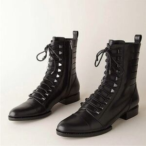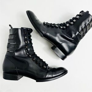 Tapered toe / Lace-up front with gunmetal speed laces / 7.5" boot shaft with inner side zip, pull tab at back, & cutout detail at sides / 1" stacked heel with treaded sole / Leather sole, insole, & lining / Color: