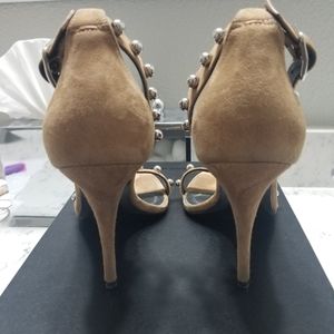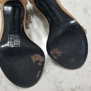 Rounded studs accent the slim straps on these velvety suede Alexander Wang sandals. Ankle strap with polished buckle closure. Covered heel and leather sole.