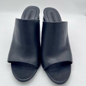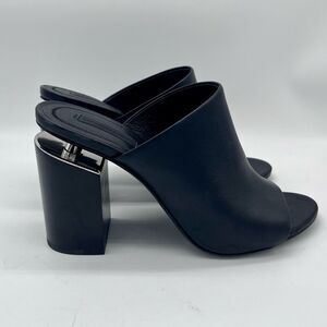 Alexander Wang Black Leather Avery Floating Heeled Mules. Open round toe. Black smooth leather. Chunky bloc heels. Silver-tone metallic detail at heel Black leather insole.