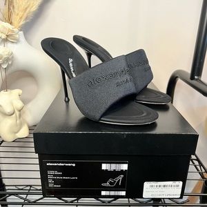 Black lycra padded mule stilettos with embroidered tonal logo upper straps. Almond-shaped toe. Stretch fabric upper for a flexible fit. Shiny enamel finish on heels. Molded comfort footbed. 4" stiletto heel.