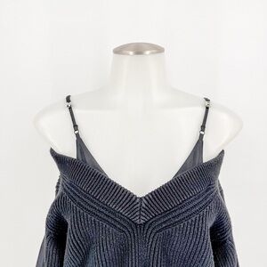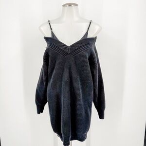 This elegant black mini dress by Alexander Wang features a chic cold-shoulder design with thin spaghetti straps and long, relaxed sleeves. Made from a soft knit material, it offers a comfortable yet stylish silhouette perfect for various occasions. The dress effortlessly blends casual comfort with a touch of sophistication.