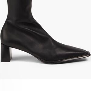 These sleek black over the knee boots by Alexander Wang are crafted from smooth leather for a sophisticated look. Their form-fitting design creates a slim silhouette that enhances the leg, making them a stylish addition to any outfit.