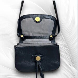 Features a soft textured finish, magnetic flap closure, gold-tone hardware, and a signature wrapped leather ring with tassel detail on the front.