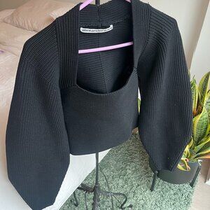 Long sleeve rib knit stretch nylon sweater in black. Square neck collar. Puff sleeves. Supplier color: Black 99% polyamide, 1% elastane. Brand: Alexander Wang. Super cool and flattering. No zipper. Some pulling and a large hole in one of the armpits. It needs repair.