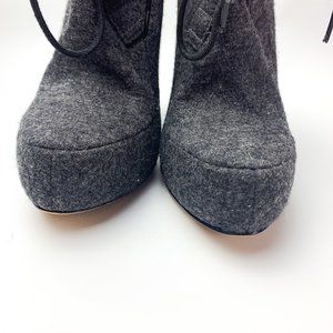 Alexander Wang Constance charcoal gray wool round-toe booties with block heels. Hidden platform and lace up tie. Platforms: 1.75" Heels: 5.5". Small dirt spot on wool and scratch on back end heel. Size 36