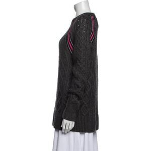 Featuring a crew neck, long sleeves, a cable-knit design, and an oversized fit. Contrast stripe detailing at the shoulders adds a modern touch. Ribbed neckline, hem, and cuffs. Pullover style. Material: 100% Wool. Fits true to size
