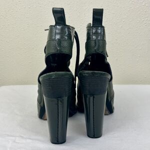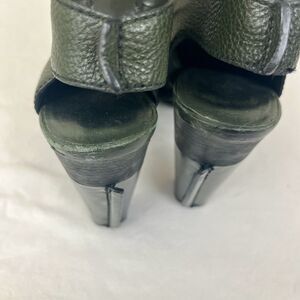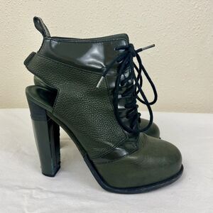 Dark green pebbles leather booties by Alexander Wang. Side zip, lace up, cut out detail. Covered 1” platform, 5” heel. Scuffing/marking seen in pics but overall in great condition.