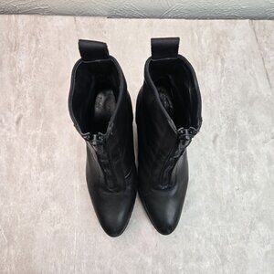 FEATURES/ACCENTS: Ankle style. High block heel. Pointed toe. Black color. Front zip closure.