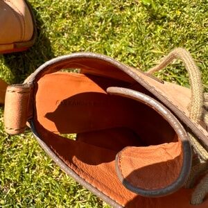 Faded Terracotta fine buck suede shoes by Designer Alexander Wang. Heel is wrapped in leather with a saddle stitch outer detail. Lace up feature makes your foot feel secure. Worn in look, feels kind of tough, workwear vibe. Bare heel detail but can wear with or without socks. Front part has a hidden platform.