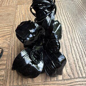Defined by the sculpted floral appliqué placed at the toe, Alexander Wang's Leonie sandals are crafted from black patent leather with a high-shine finish. The pair sits atop a 105mm high stiletto heel and features a wraparound tie-fastening ankle strap.