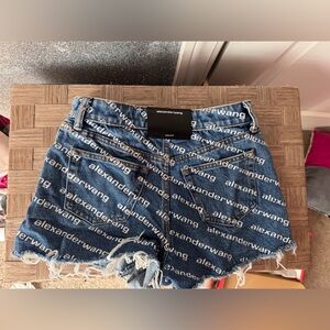 Chic denim shorts with all-over logo print. Features frayed hem and classic design.