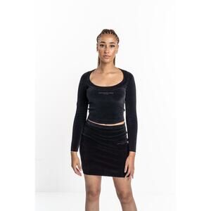 The Alexander Wang Scoop Neck Long Sleeve Top in Black features a high-density logo design for a modern and edgy look. With its scoop neckline and long sleeves, this top exudes urban sophistication and is perfect for casual outings or everyday wear.