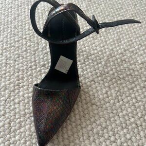 Never worn pair of pointy to ankle strap heels by Alexander Wang. The leather is printed to mimic a metallic animal skin. Rubber soles have been applied to prevent scuffing or tripping.
