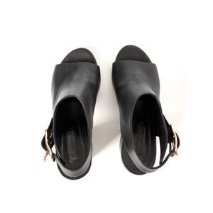 Authentic Alexander Wang Nadia sandals in smooth, soft black leather with the brand’s iconic rose-gold heel plate.