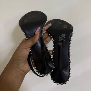 Chic black sandals with silver stud accents. Features clear strap and branded design. Ideal for stylish outings.