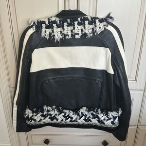 Runway piece, never worn. Statement and featuring so many details! The tweed withfrayed edges and velvet details add ladylike elegance and charm to this sleek biker leather jacket with moto stripes and silver chains. The retail price was $2295. It is a catch that can elevate even the most basic fall look. A star of your wardrobe that is still so versatile!