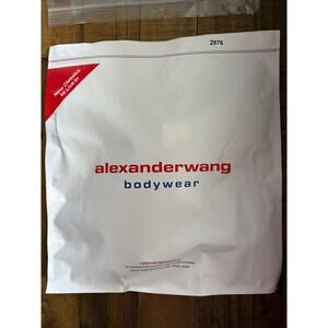 Design details: Micro ribbed stretch knit fabric, fitted bodycon silhouette, crew neckline, short sleeves, mini length with small alexanderwang bodywear logo patch at front hem.