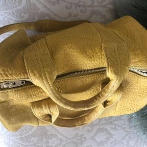 Beautiful authentic Alexander Wang Rocco Duffle/sample bag with strap in mustard yellow. A clean bag, leather is so thick and luxurious and the studded bottom of the bag is a real show stopper! It has some mild corner wear and little leather rub, but the glaring “flaw" is a pen mark on the end of the bag. I was always able to hide it well and have never tried to remove the stain for fear I would ruin the bag......because it is such a fun one! Big celeb favorite of 2012, $1200+RV
