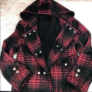 DOUBLE BREASTED DUFFLE COAT IN A BLACK PLAID DESIGN WITH HOOD AND FOUR DOME METAL SNAP FRONT CLOSURES. TWO FRONT AND BACK POCKETS.