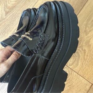 Sleek black loafers with a shiny finish. Features Alexander Wang logo detail. Perfect for a chic look.