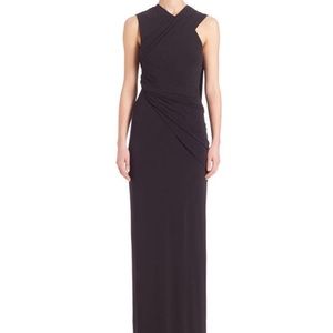 Asymmetric draped column gown with an open back and scarf like drape. Fabric is a lightweight Italian jersey. Brand new, never worn, tags attached.