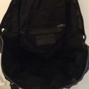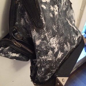 Alexander Wang Beige Emily Bag repurposed with paint over the burlap sections only. Logo plate at side. Contract pebbled leather trim and antiqued silver hardware. Double roll handles, two way zip main compartment closure. Lined interior features zip pocket. NO STRAP. 11hx15Lx6D