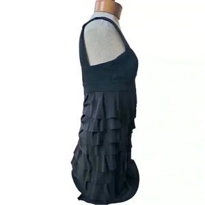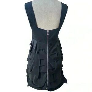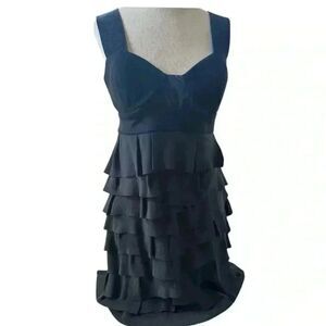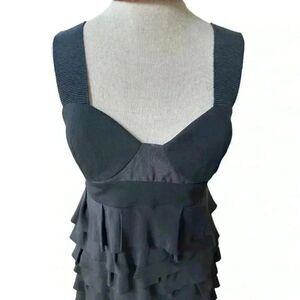 Ruffled tiers in silk adorn this perfect little black dress! Bustier bustling with accordion straps. Silver back zipper.
