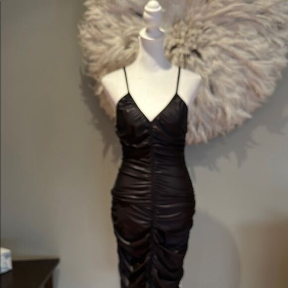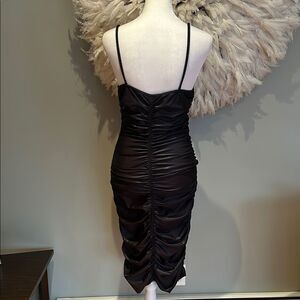 Elegant black dress with ruched detailing and spaghetti straps. Perfect for evening wear. Super flattering. Molds to your body