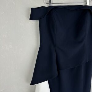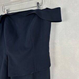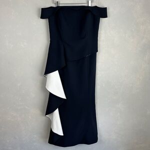Alexander by Daymor size 16 maxi gown 1060 off shoulder ruffled skirt navy white trim trumpet bottom.