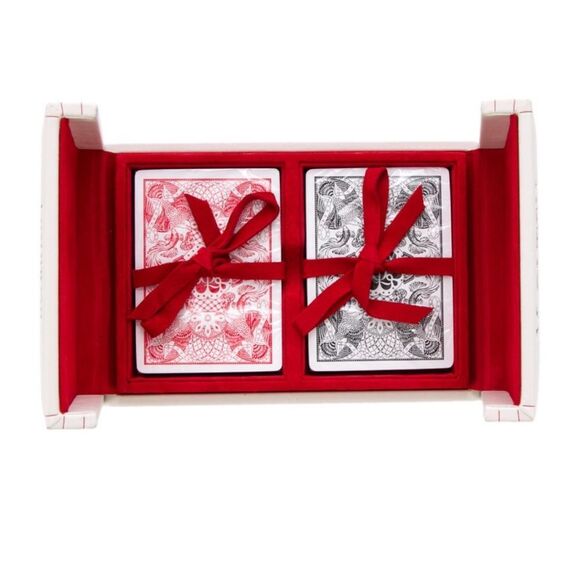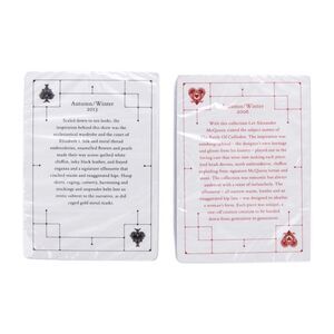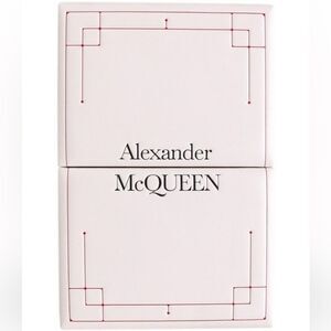 Creme leather Alexander McQueen playing card holder with red details at edges and sides, red velvet lining in interior. Includes box and double set of hand drawn Alexander McQueen playing cards.