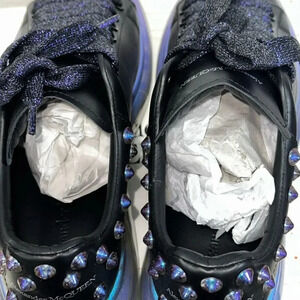 Clean interior & exterior. No scuff or flaws to mention. Color is black leather with shimmer blue platform heel.