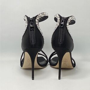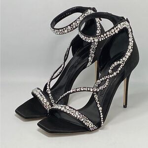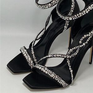 Shimmering crystals adorn the straps of these satin sandals, flaunting a square toe and striking stiletto heel.