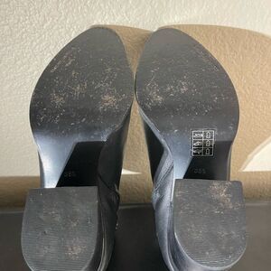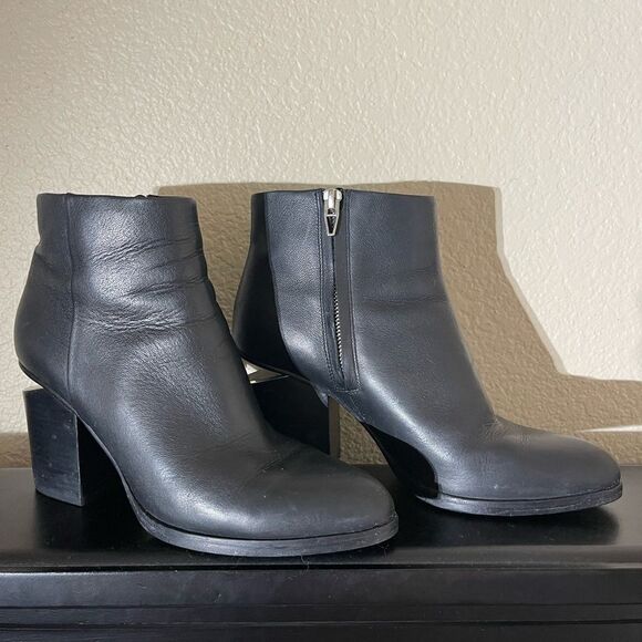 These Alexander Wang ankle boots feature a sleek black leather design with a smooth matte finish. The chunky block heel provides stability while the rounded toe offers a classic silhouette, making them a versatile addition to any wardrobe.