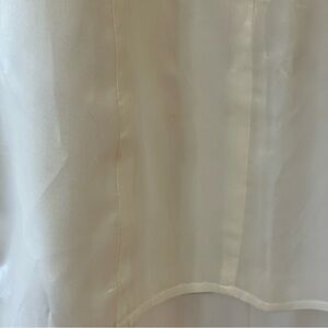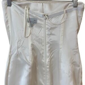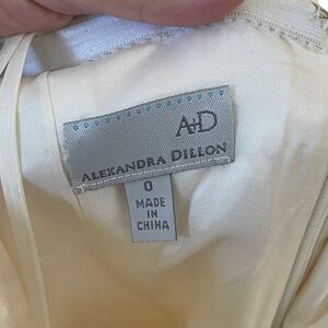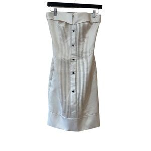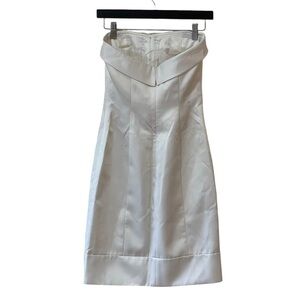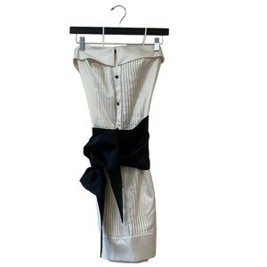 Elegant tuxedo dress with black sash from Alexandra Dillon. Sweetheart neckline with non-slip silicone grip to ensure it stays put all night. Figure flattering silhouette with a waist accentuating sash tie. Back zipper closure. It has a few minuscule stains likely from storage as shown. Otherwise in excellent pre-owned condition. Perfect for all those holiday parties.
