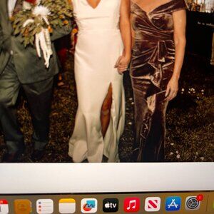 Cecelia is a v-neck silk crepe gown with cap sleeves, embroidered side cut outs and classic fitted skirt. This gown is hand-embroidered and there may be variations in layout.