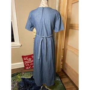 This Alexandra Lee vintage denim maxi dress shines for its timeless charm. Blue denim featuring short sleeves and a flattering long silhouette, rosette embellishments, shoulder pads and pleated design. It has a convenient back zipper closure for easy wear. Pre-owned in great vintage condition. This unique piece is a standout addition to any vintage lover’s wardrobe!