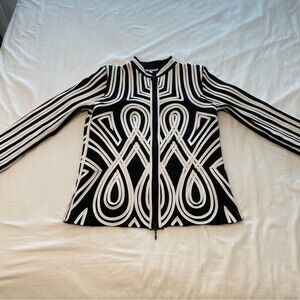 Stunning designer jacket and blouse by Alexandra Rosati. Black and white fabric sewn on to black sheer mesh. Pattern is a swirl, geometric & three dimensional effect. Matching blouse has sweetheart neckline and is sleeveless. Jacket has long sleeves, mandarin collar, and zipper which can zip up up or zip down. This is an eye catching ensemble that you'll get lots of compliments on!