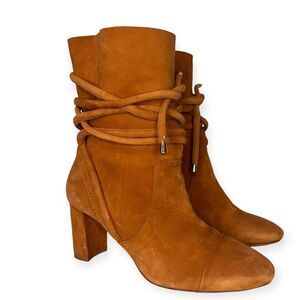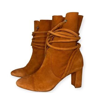 Cinnamon suede Alexandre Birman Betsy ankle boots with tonal cap-toes, cutout at uppers, covered heels and wraparound tie closures at ankles.