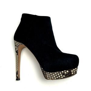 Beautiful Alexandre Birman Black Suede Real Piton Skin Heels and Platform Ankle Booties. Side zip closure