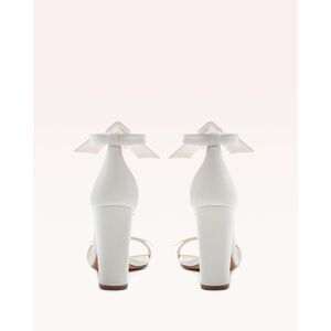Meticulously crafted from luxurious white leather, this timeless sandal features two iconic bow adornments and a sophisticated 90mm block heel. From day to night, this versatile shoe adds an elegant touch to any look. Perfect for weddings and beyond.