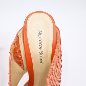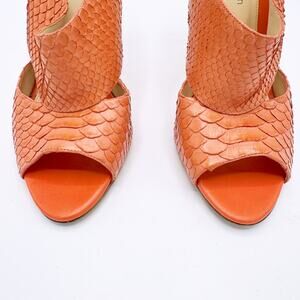 Crafted from exotic python skin in an orange hue, they carry a feminine design with cutout vamps and high stiletto heels.