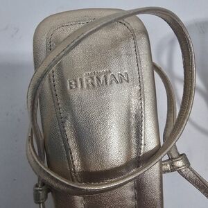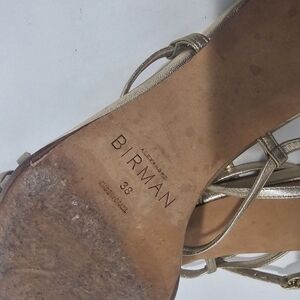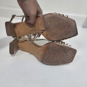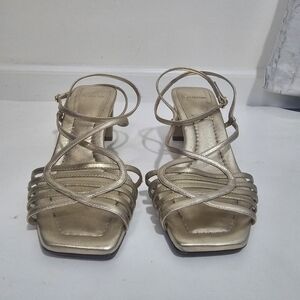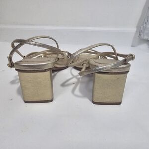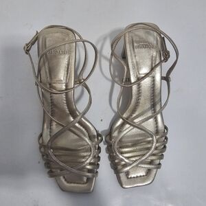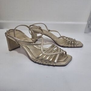 Alexandre Birman Naya Slingback Gold Strappy Heeled Sandal Metalic Evening. Ankle buckle closure, Square toe, leather.