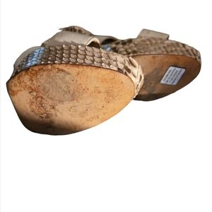 Today for your consideration we have a beautiful pair of Alexandre Birman heeled T-strappy sandals. These stunning sandals are made of python snake, leather, metal and leather sole. The T-strap has a zippered closure. Heel measure 5" high with a 3/4" high platform.
