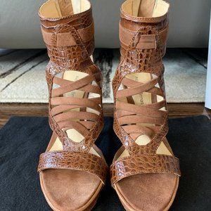 Vintage barely worn authentic Alexandre Birman heels bought from Neiman Marcus. Suede leather and crocodile-embossed leather combo in caramel color. Leather sole, gunmetal zipper and pull tab. NOTE: I think shoe runs a little big. I am 5.5, can wear size 6 in other brands. The box says EU 36 which should be US 6.