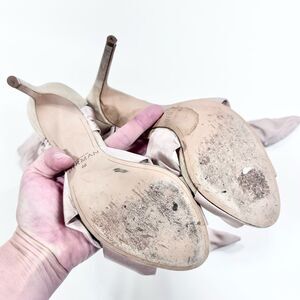 Alexandre Birman nude suede satin Katherine wrap stiletto heels 40. Perfect wedding shoe! Small stain on heel peg, pictured. Slight discoloration to heel back, pictured. Bottoms have minor wear, but are dirty.